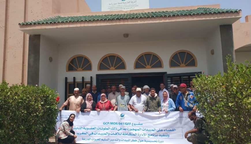 كجزء من مشروع GCP / MOR / 041 / GFF : ” القضاء على مبيدات الآفات المنتهية الصلاحية وتنفيذ برنامج التدبير المتكامل للآفات ومبيدات الآفات في المغرب” ، قام المكتب الوطني للسلامة الصحية للمنتجات الغذائية (ONSSA) و منظمة الأغذية والزراعة للأمم المتحدة (اFAO) في 23 يوليو 2019 بتنظيم تدريب لمدة يومين على الاستعمال المعقلن لعبوات مبيدات الآفات للاستخدام الزراعي للمزارعين والمستشارين الزراعيين في المكتب الملحق بغرفة الزراعة بسوس ماسة في تزنيت وفي 24 يوليو 2019 في معهد الفنيين المتخصصين في الزراعة في أولاد تيمة (تارودانت) .