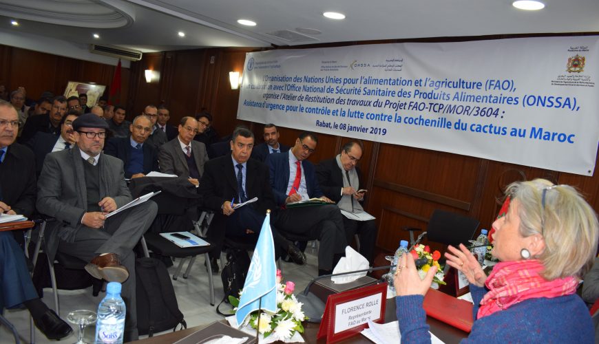 ONSSA in collaboration with the FAO organized on January 8, 2019 in Rabat, the workshop for the restitution of the work of the FAO-TCR/MOR/3604 project (Emergency assistance for the control and fight against the cactus mealybug in Morocco ). This workshop aims to establish an assessment of the activities, the results of the project and the prospects to guarantee the sustainability of the achievements. It should be noted that the FAO-TCR/MOR/3604 project falls within the framework of FAO support for the Green Morocco plan and has made it possible to support ONSSA in the work to combat the spread of cactus mealybug in the national territory.