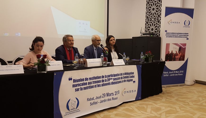 L’Office National de Sécurité Sanitaire des produits Alimentaire (ONSSA) et L’Association Marocaine de Nutrition Infantile (AMNI) ont organisé le jeudi 29 mars 2018, à l’Hôtel Sofitel Jardin des Roses à Rabat, la réunion de restitution de la participation nationale aux travaux de la 39ème session du Comité Codex sur la nutrition et les aliments diététiques ou de Régime (CCNFSDU) qui a eu lieu à Berlin en Allemagne du 04 au 08 décembre 2017.