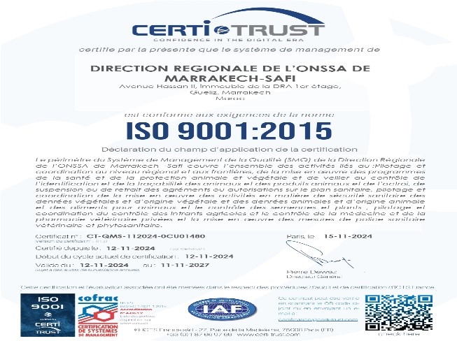 La Direction Régionale de l’ONSSA Marrakech – Safi vient d’être certifiée conformément aux exigences de la norme NM ISO 9001 Version 2015, pour l’ensemble de ses activités. Cette certification vient conforter la politique qualité de l’Office qui depuis sa création ne cesse d’améliorer sa performance et ses processus pour un service de qualité.