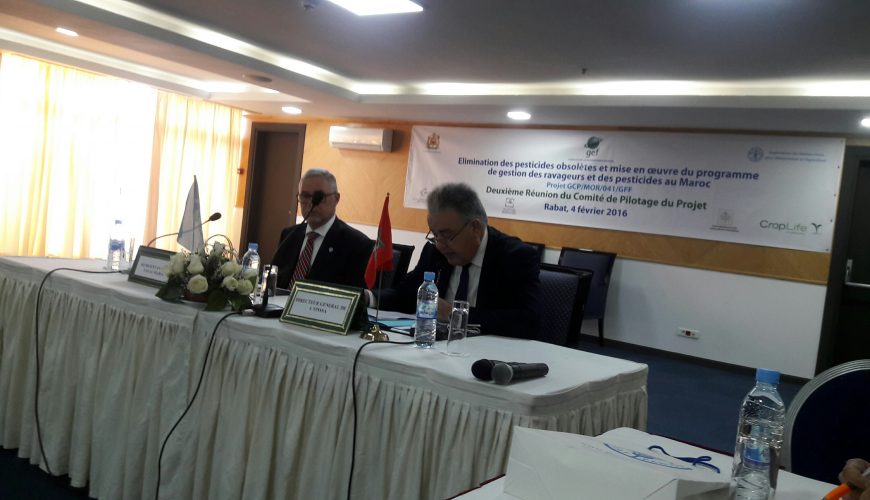 L’Office National de Sécurité Sanitaire des Produits Alimentaires (ONSSA) et l’Organisation des Nations Unies pour l’alimentation et l’agriculture (FAO) ont organisé, le jeudi 04 février 2016 à Rabat, la 2ème Réunion du Comité de Pilotage du Projet GCP/MOR/041/GFF « Élimination des pesticides obsolètes et mise en œuvre du programme de gestion intégrée des ravageurs et des pesticides au Maroc », sous la présidence de M. Ahmed BENTOUHAMI, Directeur Général de l’ONSSA et M. Michael George Hage, Représentant de la FAO au Maroc. Cette réunion, qui a connu la participation des partenaires nationaux, des organisations professionnelles, et de « CropLife International », a été consacrée à la présentation de l’état d’avancement du projet depuis son lancement en mars 2015 et à la validation du plan de travail et du budget pour l’année 2016. Ainsi, sur le plan des réalisations au titre de l’année 2015, les principales actions menées ont été présentées (signature de deux accords entre la FAO et l’ONSSA et entre « Croplife International » et l’ONSSA ; situation de l’inventaire des pesticides obsolètes, etc.).