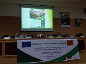 M. Ahmed Bentouhami, Directeur Général de l’ONSSA et M. Didier Nils, Représentant la Délégation de l’Union Européenne au Maroc, ont présidé la cérémonie de clôture du projet de jumelage institutionnel sur le contrôle des produits phytopharmaceutiques, des fertilisants et supports de cultures, qui a eu lieu le mardi 16 mai 2017 à l’Institut Agronomique et Vétérinaire Hassan II à Rabat , en présence des représentants des ambassades de France et d’Allemagne ; du ministère français de l’Agriculture de l’Agroalimentaire et de la Forêt (MAAF), de l’Agence nationale française de Sécurité sanitaire de l’Alimentation, de l’Environnement et du Travail (ANSES), de l’Office Fédéral Allemand pour la Protection des Consommateurs et la Sécurité Sanitaire des Aliments (BVL) , ainsi que des professionnels et de différents départements ministériels marocains.