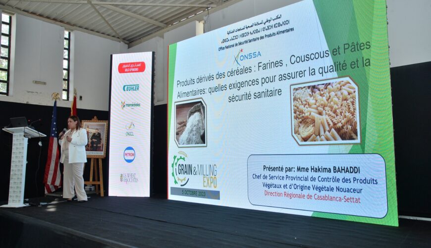 L’Office National de Sécurité Sanitaire des Produits Alimentaires, représenté par sa Direction Régionale de Casablanca – Settat, a participé les 04 et 05 octobre à Casablanca à la neuvième édition du Salon international des Industries Céréalières “Grain et Milling Expo”, organisé sous le thème « La Souveraineté Alimentaire : Cas des céréales ».